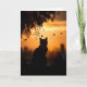 A sympathy card for the loss of a beloved cat, showing a tranquil sunset casting a warm glow over the silhouette of a graceful feline as birds drift peacefully across the sky.