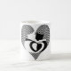 This is a fun modern design featuring two cats, black and white cuddled up with tails shaped into a heart. The backdrop is black white chequers. It's a modern design for cat lovers and cat owners.