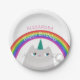 Cute, unique, colorful, personalized kawaii Caticorn girl birthday paper plate with name, cat unicorn and rainbow.
