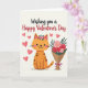 This card features an orange cat at the center with wide black eyes, rosy cheeks, and a small, sweet smile. A ring of soft pink and white flowers sits on its head like a simple crown. Next to the cat is a bouquet of roses that fades from light pink to deep red, with green leaves tucked around the blooms. The flowers are wrapped in brown paper and tied with a red bow, making it feel like a thoughtful gift ❤️🍫. The background is a light cream color, and several small pink hearts float around the cat and bouquet. Near the top, the message “Wishing you a Happy Valentine’s Day” is printed, mixing a cursive script with neat serif letters in a dark color that stands out clearly 💌. It’s a warm, friendly design that fits romance, affection, or close friendship, and it’s perfect for sharing your Valentine’s Day sentiments with someone you care about.