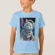 A green eyed white cat in space suit outside of the space station with stars and planets.