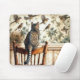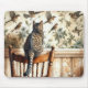 A tabby cat perches on a wooden chair, intently observing a wallpaper decorated with bird illustrations and floral designs