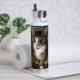 A water bottle featuring a photo of a cat.