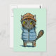 This is a cartoon style watercolor illustration of a grey cat with brown stripes wearing a blue down vest and a brown beanie.