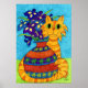 This happy orange-striped cat is sitting on a spring green tablecloth with her tail wrapped around a beautiful Mexican talavera vase full of gorgeous irises in various shades of purple. The entire scene takes place against a sky blue background.