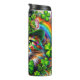 This whimsical image features a colorful cat with bright green eyes, wearing a green leprechaun-style top hat with a black buckle and a green bow tie. The cat's fur is a vibrant mix of rainbow colors, and the background is filled with swirling rainbows, green shamrocks, and splashes of colorful paint, creating a cheerful and festive St. Patrick's Day-themed artwork.