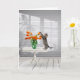 Orange tulip bouquet on old wooden table and playful gray tabby cat with window shadow on brick background.
