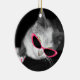 An ornament featuring a black and white photo of a cat with pink sunglasses and claws.