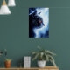 The image features a close-up portrait of a black cat with piercing red eyes. The cat's fur is rendered in a soft, almost ethereal style, with a slight blue hue. The background is a blurred, abstract design of blue and white, creating a sense of mystery and intrigue. The cat's gaze is directed towards the right, its whiskers prominent and its expression alert and watchful. Perfect gift for cat lovers.