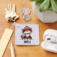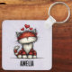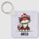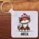 Keychain with a whimsical drawing featuring a big orange red kitty cat.