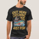 This black t-shirt features a cartoon illustration of a person sitting in a small boat, reeling in a very large and colorful fish. The text above the illustration reads "OUT HERE CATCHING" in a bold yellow font, with "MORE THAN" in a smaller yellow font to the right. Below the illustration, the phrase "JUST FISH" is displayed in a large, bold yellow font. This design playfully suggests that fishing offers more than just catching fish, perhaps referring to experiences, memories, or peace.