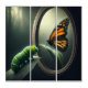 A green caterpillar and a colorful monarch butterfly are positioned on opposite sides of an oval mirror with droplets of water on its surface