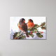 A beautiful vintage winter canvas print featuring two robins perched on the branch of a holly bush, painted by the German artist Catherine Klein.