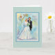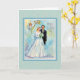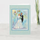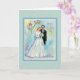Beautiful vintage image of a bride and groom with a little cherub angel holding a Rosary above them. A bell is also in the image above their heads with the words "Wishes on your Wedding Day.