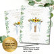 Elegant Christian, Catholic faith wedding invitation with text template fields both sides for you to include wedding ceremony, reception, rsvp, gift registry brief order of the day program. Sunflowers, greenery leaves, rustic wood cross decorated invitation.