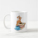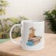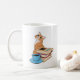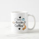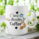 Cute orange cat, blue coffee cup and pile of books. Book lovers quote coffee mug.