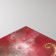 A stylized cat face made of glowing gold curves and curlicues, with wide green-gold eyes, against a red fractal background.