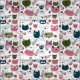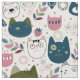 Cartoon like graphic, faces of cats in muted warm colors (green teal pink), seamless repeat pattern