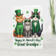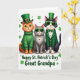 This card shows three dressed-up cats sitting together on a bright white background, looking like close friends sharing a quiet laugh 💚. On the left, an orange tabby with emerald eyes wears a green turtleneck and a leprechaun top hat with a gold buckle, leaning in with an easy, affectionate calm. In the middle, a fluffy gray cat faces forward in lime-green sunglasses, and a small black heart on its chest adds a sweet, tucked-away hint of devotion. On the right, a black-and-white tuxedo cat wears a green suit jacket with gold buttons, a striped shirt, a green bow tie, and a matching hat, posed like it’s proudly keeping the group together ☘️. Around them, scattered four-leaf clovers and tiny asterisk shapes dot the white space, like confetti frozen midair. Along the bottom edge, the message “Happy St. Patrick’s Day Great Grandpa” sits centered in green lettering. The green outfits pop against the white background, and the clovers are spaced across the page in small clusters near the cats’ shoulders and above their hats.