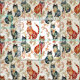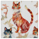 Fabric in a pattern of watercolor cats in fluid, swirling brushstrokes inspired by Chinese art, in gradients of red, blue, green, and black, blending harmoniously with stylized leaves.