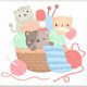 A digital illustration depicts three cartoon cats nestled amongst balls of yarn and knitting needles. The cats are rendered in a flat, 2D style with simple shapes and bold outlines. The cat on the left is grey tabby with white accents; its body curved around a ball of peach-colored yarn. In the center, a grey and brown bicolor cat peeks out from a woven basket, its paws resting on a blue knitted fabric. To the right, a light orange and white cat sit atop a ball of mint green yarn, its paws clasped together.