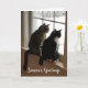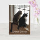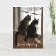 A striped tabby and a black and white cat sitting in the window looking out at the snow. Blank inside.