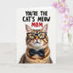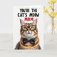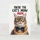 This card features a digitally illustrated tabby cat centered on a bright white background, dressed up with a dark bow tie and black-rimmed glasses that give it a sweet, attentive look ❤️. The cat’s chartreuse-green eyes gaze straight ahead through the lenses, creating a friendly, almost companionable connection. Its fur is rendered with layered stripes in tawny, amber, and deep brown, with fine texture that makes the coat look soft and touchable. Above the cat, uppercase text reads “YOU’RE THE CAT’S MEOW MOM,” arranged in a neat stack across the top area. Most of the lettering appears in dark tones for strong contrast, while “MOM” stands out in a bright red accent. The open space around the figure keeps the focus on the cat’s dressed-up charm, like it’s posing proudly for someone it adores 🌼. The bow tie sits neatly under its chin, and the glasses frame the wide green eyes against the crisp white backdrop.