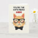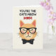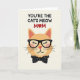 This greeting card features a simple graphic of a ginger-toned cat head centered on a pale cream background, giving the scene a calm, affectionate feel ❤️. The cat has soft toasted-orange fur with blush pink inside the ears and on the cheeks, like it’s quietly basking in attention. It wears black-framed glasses and keeps its eyes gently closed under small lashes, suggesting a tender, contented expression. Just below the face, a neat black bow tie with small white dots adds a sweet, dressed-up touch. Across the top, the message “YOU’RE THE CAT’S MEOW” appears in dark lettering, with “MOM” placed nearby in bright red. The “O” in “MOM” is replaced by a small red heart, adding a romantic, caring note without needing extra decoration 🌼. The overall layout stays uncluttered, with the cat and text spaced comfortably and the red heart standing out against the light background.