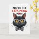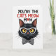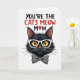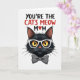 This card features a stylized black cat head centered on a bright white background, drawn with smooth dark fur and warm brown shading inside its pointed ears. Large golden-yellow eyes with narrow black pupils give the cat a knowing, affectionate gaze that feels like it’s sharing a private joke with you ❤️. White spectacles sit across its nose, decorated with small circular accents that add a smart, sweet touch. Just below the face, a softly shaded grey bow tie is neatly tied, pairing nicely with the cat’s long, flowing whiskers. At the top of the design, the message “YOU’RE THE CAT’S MEOW M♥M” is placed in uppercase lettering, with most of the text in black and the heart symbol in red 🌼. The wide white space around the portrait keeps everything focused on the cat’s expressive face and the contrasting details. The cat’s glasses and bow tie create a gentle, friendly charm, like it dressed up just to be close to someone special. The red heart sits in the word “M♥M,” standing out brightly against the black letters above the cat’s ears.