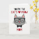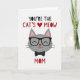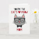 This card features a friendly grey cat face centered on a bright white background, giving the design an airy, open look. Across the top, the message “YOU’RE THE CAT’S MEOW MOM” appears in large lettering, mostly in deep black with parts in rich red, and a small red heart stands in for the apostrophe ❤️. The cat’s rounded face wears thick, dark glasses that add a sweet, thoughtful touch, like it’s looking at someone it adores. Its eyes are drawn as soft curved lids, suggesting a calm, affectionate smile, and a tiny red nose adds a warm point of color. Thin black whiskers stretch from both cheeks, while the upright ears show pale pink inner details for extra softness. Just below the chin, a neat black bow tie with small white dots brings a dressed-up, caring feel to the character. The red heart mark sits near the top line of text, and the bow tie is centered beneath the face with crisp black-and-white contrast 🌼.