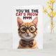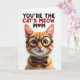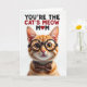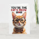 Designed with a close-up portrait of an orange tabby cat, the card centers on a friendly, humanlike feline with classic stripes and a tender, knowing gaze. Dark-rimmed round glasses rest on its nose, and a spotted bow tie sits neatly at its neck, adding a sweet, affectionate charm like it’s dressed up for someone it adores ❤️. The fur is shown in warm oranges, creams, and soft browns, with fine whiskers and gentle shading that make the face feel cozy and inviting. The background stays plain white, keeping all attention on the cat’s golden eyes and calm expression. Across the top, the message “YOU’RE THE CAT’S MEOW MOM” appears in large uppercase lettering, split into two contrasting tones for emphasis. A small red heart sits near the text, tying the words to the cat’s fond, attentive look 🌼. The glasses have a subtle shine, and the bow tie shows tiny dotted spots against the bright white space.