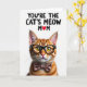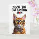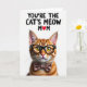 This card features a well-groomed tabby cat posed against a bright white background, with its face filling the lower half like it’s leaning in for a friendly, affectionate hello ❤️. The fur shows warm amber and russet striping with careful detail, giving the cat a cozy, companionable look that feels like a gentle nuzzle. Dark-rimmed glasses sit on its nose, drawing attention to golden eyes that catch the light in a way that suggests a knowing, caring gaze. A brown bow tie with small pink-and-white flower shapes rests under its chin, adding a sweet, dressed-up touch that reads like a loving tribute. Across the top, the message “YOU’RE THE CAT’S MEOW MOM” is printed in black, centered high above the cat’s head. One letter is replaced by a red heart, adding a warm accent and a little flourish 🌼. The lighting is bright and even, making the whiskers stand out sharply and the nose appear softly pink.