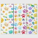 A vibrant and playful cartoon pattern featuring an array of colorful cat faces, paw prints, and playful text elements. The cat faces are depicted in various colors such as yellow, blue, purple, and peach, each with distinct expressions and features like whiskers, round eyes, and small noses. Interspersed among the cat faces are paw prints in a rainbow of colors including blue, orange, red, purple, and green, adding to the whimsical nature of the design. The words "MEOW!" and "PURRR" are scattered throughout the pattern in bold, cartoonish fonts, enhancing the overall playful theme. The background is a clean white, which allows the colorful elements to pop and creates a cheerful and engaging visual experience.