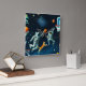 This cool computer-generated digital art graphic shows cats playing basketball in space with astronauts. Created with multiple image generations of the AI source DALL-E, this futuristic artwork is fun for fans of technology, space, astronauts, and cats!