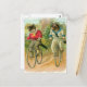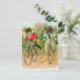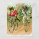 Vintage artwork of two cats dressed in clothes riding bikes through the park