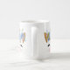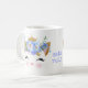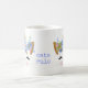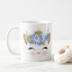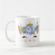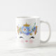 Cat lovers ceramic mug, with pretty graphics of a cartoon cat face with big eye lashes, and a golden crown with blue flowers. Text, on the front of the mug reads cats rule, and can be personalized to read what you want.