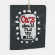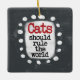 A cute typographic design that says "Cats Should Rule The World". It's black and red text on a white rectangle with funky, playful dots surrounding it sits on a solid, textured gray background.