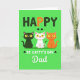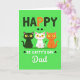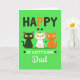This design shows an emerald green background that sets a festive St. Patrick’s Day scene, with three cartoon cats sitting front-facing in a neat row 💚. A sleek black cat, a bright white cat, and a warm orange tabby sit shoulder to shoulder, their wide yellow eyes and soft pink noses giving them an affectionate, friendly look. Each cat has lightly blushed cheeks, as if they’ve been caught sharing a sweet moment together. Across the top, the word “HAPPY” appears in thick, shadowed letters, mostly dark with one orange “P” that stands out. Beneath the cats, “ST. CATTY’S DAY” is written in dark lettering and flanked by small black shamrock icons ☘️. Tiny green shamrocks are sprinkled across the white cat’s fur and tail like confetti. Near the bottom, the name “Dad” appears in small white lettering against the green backdrop.