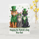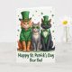 This card shows three dressed-up cats lined up across a white background, ready for St. Patrick’s Day fun 💚. On the left, an orange tabby wears a green top hat with a shamrock badge and a green hoodie, looking sideways with bright eyes that seem to linger on the others. In the center, a smooth grey cat sports neon green sunglasses and a small gold heart pendant, standing close enough to feel like the confident friend holding the group together. On the right, a black cat matches the party look with a green top hat and green sunglasses, plus a green vest and bow tie over a white shirt, angled as if posing for a shared photo. Around them, small green shamrocks and clovers float in the background, keeping the scene light and festive ☘️. Across the top, the message “Happy St. Patrick’s Day Dear Dad” sits centered in green lettering. A thin green strip runs along the bottom like a little patch of ground beneath their feet.