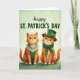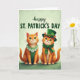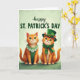 This card features two orange tabby cats sitting close together along the lower part of the design, facing forward with soft fur and gentle expressions that feel like shared companionship 💚. The left cat wears a green waistcoat with a white floral collar, and its bright green eyes add a sweet, attentive look. The right cat leans into the festive look with a green top hat that has a gold buckle and a shamrock, plus a green polka-dot scarf tied into a neat bow ☘️. Behind them is a light sage-green background with a soft, lightly textured wash that keeps the scene calm and airy. Near the top, the message “happy ST. PATRICK’S DAY” is centered, with “happy” in a flowing cursive style and “ST. PATRICK’S DAY” in a simple all-caps print. Small details like fine whiskers, tiny fur strokes, and crisp green accents around the outfits add depth without crowding the space. The hat’s shamrock sits slightly angled above the right cat’s ear, and the scarf’s bow loops are clearly defined against the pale green backdrop.