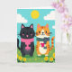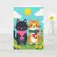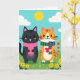 Designed with two stylized cats centered in the scene, the artwork shows a sleek dark-furred cat in a pink scarf standing close beside an orange-striped cat wearing a green-and-purple striped scarf. Their rounded shapes, rosy cheeks, and small smiles create a gentle, friendly closeness, as if they’re sharing a quiet moment together ❤️. The orange-striped cat holds a bright pink heart near its chest, adding a romantic touch without needing any extra details. Behind them, an aqua sky stretches across the top with a yellow sun and a few soft white clouds drifting nearby. Below, a green meadow fills the lower half, sprinkled with simple yellow flowers and tiny star-like marks 🌼. There’s no visible headline or message text, leaving plenty of open space around the characters for writing. The strongest color accents are the pink heart and scarves, set against the calm sky and grassy field. The sun sits high in the aqua sky above the two cats, with the clouds spaced loosely to either side.