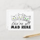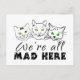 We're All Mad Here text and drawing of three funny cat faces with yellow and green eyes. Horizontally oriented or landscape aspect ratio products and souvenirs