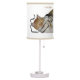 Displayed on a Lamp Shade which is on a Table Lamp, is a photograph of an orange and white Cat playing with a string, with the words "Cats Rule".