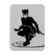 This striking graphic captures Catwoman in her element, showcasing her agility and stealth as she prepares for action. The illustration is rendered in bold black and white, emphasizing the sleekness of her costume and the dynamic movement of her pose. Catwoman is depicted crouching with a whip coiled at her side, her gaze focused and calculating. The splattered ink effect around her adds a sense of urgency and the chaotic environment in which she thrives. This artwork not only highlights Catwoman's iconic status as a skilled thief and anti-heroine but also her complex relationship with Gotham and its dark knight. It's a powerful portrayal of one of Batman's most enigmatic and formidable allies and adversaries.