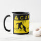 Yellow and black caution sign with a fish trying to eat a stick figure.