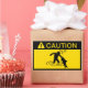 Yellow and black caution sign with a fish trying to eat a stick figure.