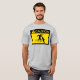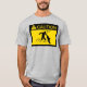 Yellow and black caution sign with a fish trying to eat a stick figure.