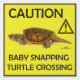 Caution baby snapping turtle crossing sign. Baby snapping turtles hatch in the late summer. Help people keep aware that the turtles may be crossing the sidewalk, trail or walking paths.