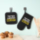 Fun black oven mitt and pot holder with a warning sign saying CAUTION CRANKY CELIAC. Perfect gift idea for Celiacs.