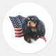 USA! America! Shout your pride with this awesome flag Patriotic background with this AKC dog breed Cavalier King Charles Spaniel in the forefront. Show your pride with this design on a t-shirt, mug, keychain, tote, magnet, button or greeting cards.
